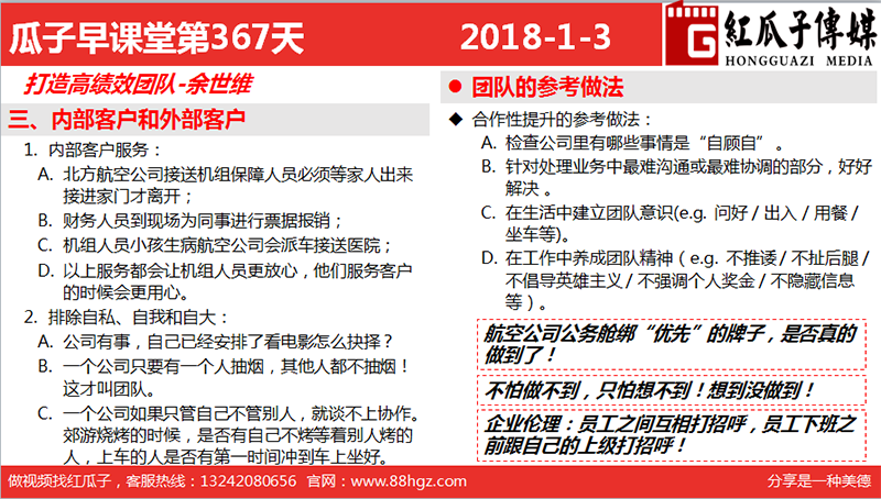 D. 在工作中养成团队精神(e.g. 不推诿/不扯后腿/不提倡英雄主义/不强调个人奖金/不隐藏信息等)。