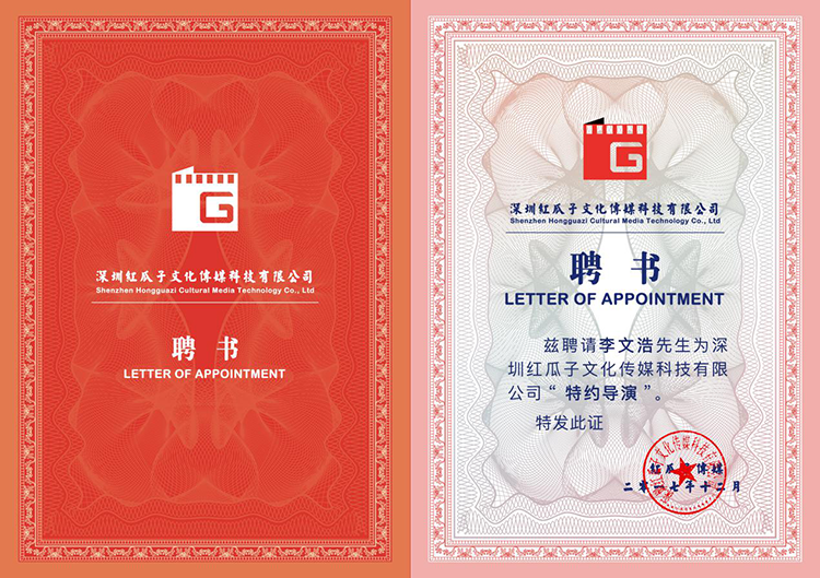 2018年01月09日,深圳红瓜子传媒科技有限公司聘请原央视总导演李文浩为特约导演。红瓜子传媒总经理杨顺林在公司多功能厅给李文浩导演颁发了聘书。