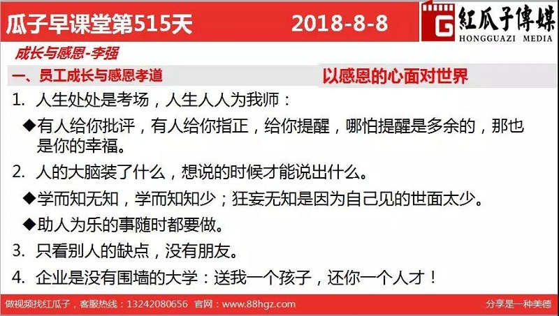 红瓜子传媒首页>相关资讯>最新动态>瓜瓜早课堂第515期-员工成长与感恩孝道