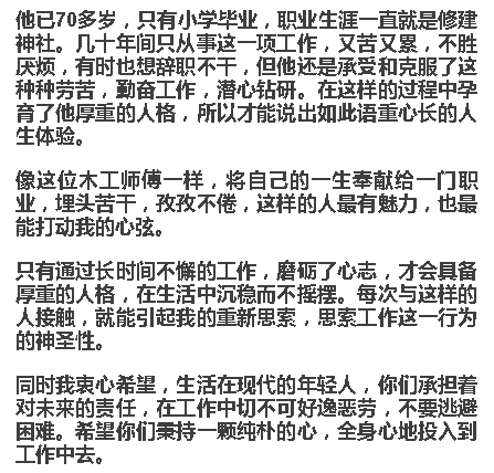 我曾在一个电视访谈节目中听过一位修建神社的木匠师傅的话,很受感动。他说: