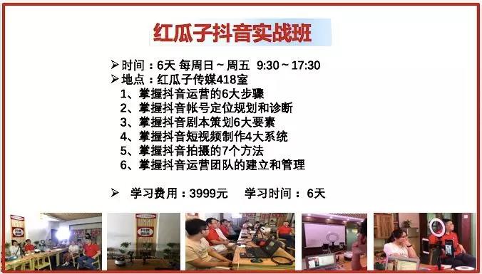 5G时代来临,信息以短视频形式来传播,抖音是全球短视频流量最大的平台,沃尔玛一条抖音增加2000万收入,一条抖音为华为手机单店增加650万收入,怎样用好抖音,对我们个人和公司都非常重要,红瓜子抖音研究院每天都有组织《抖音剧场》节目和每周日都举行《抖音特训营》培训,欢迎大家积极参加。