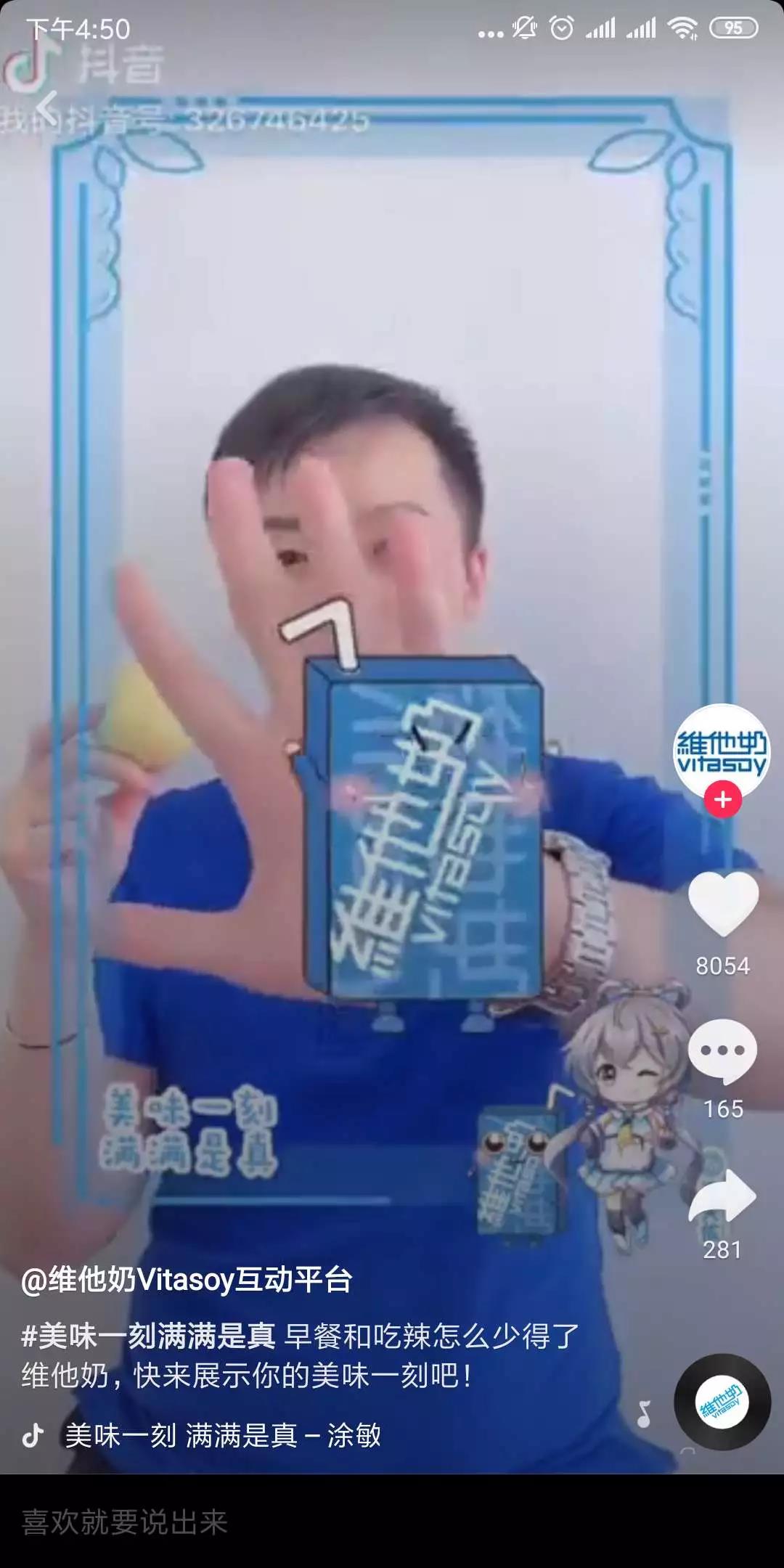 二次元是年轻文化中的重要组成部分,为了找到与年轻人群的对话点,维他奶还与深受年轻人喜爱的虚拟偶像洛天依合作,打造刷屏级的抖音定制贴纸。在贴纸的设计上,维他奶下了不小的心思,为洛天依穿上品牌标志性的“维他蓝”颜色衣服,安排以维他奶盒为原型设计的维他小盒作伴。通过多样式的品牌元素植入和联动,维他奶将有趣好玩的品牌形象植入到用户心中,俘获了大波年轻粉丝。