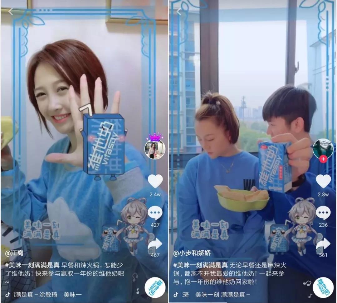 挑战赛开始后,维他奶同步邀请两名拥有百万粉丝的达人@江离 和@小步和娇娇 参与挑战赛。两位达人分别根据自身的特点和优势,创作出优质参赛视频,带动#美味一刻满满是真#热度迅速上升。