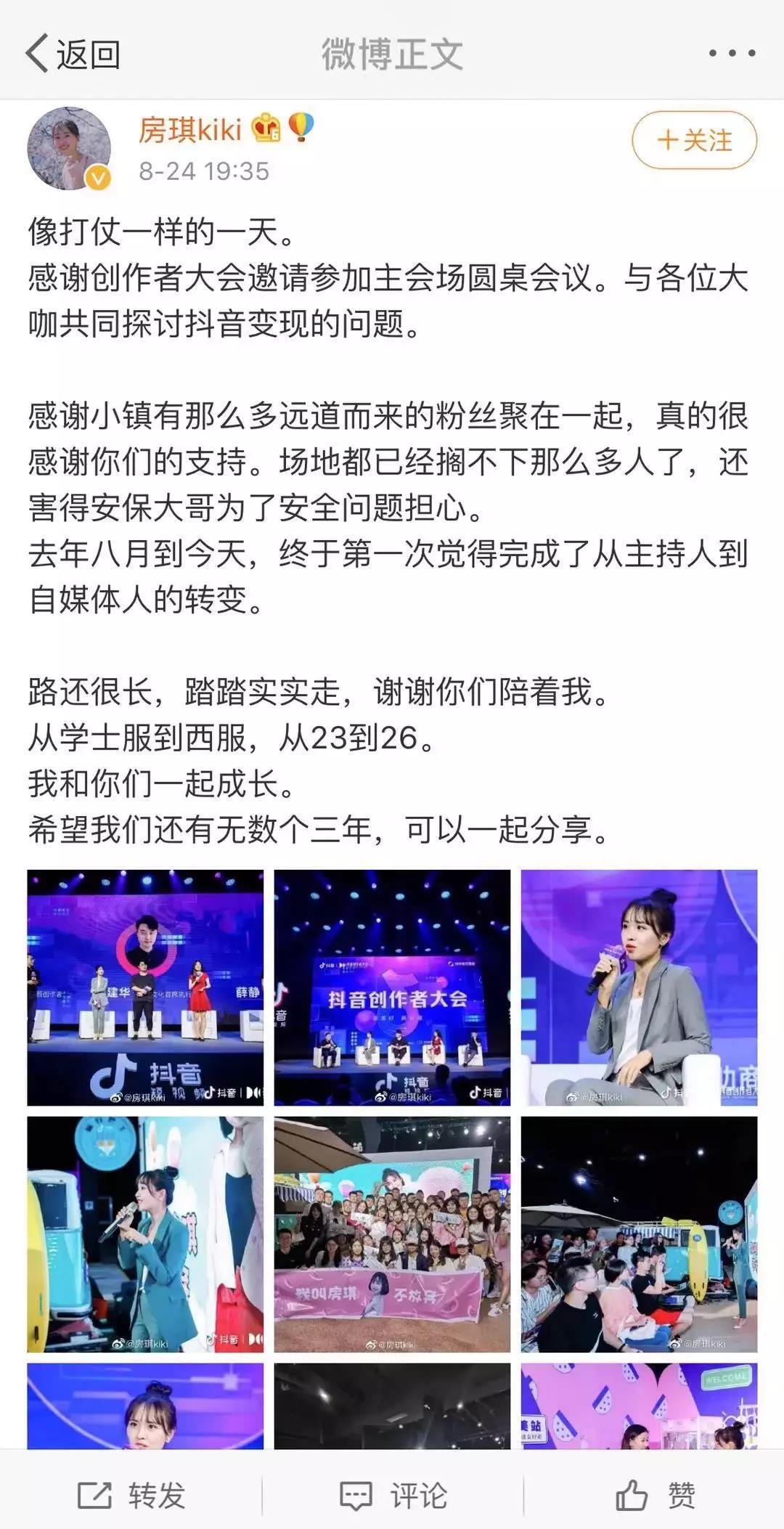来源:新榜(ID:newrankcn)从主持人到旅游博主的转变 “从去年8月到今天,第一次觉得自己完成了从主持人到自媒体人转变……”这是「房琪kiki」8月24日的一条微博内容。