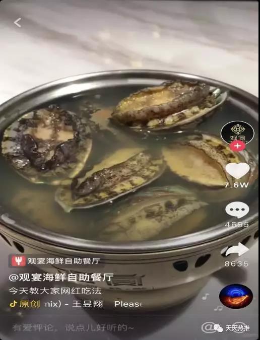 我们根据“观宴”的实际情况和顾客的行为习惯及爱好,也设计了一出鲍鱼网红吃法的视频,视频一经发出点赞量达到7.6万,评论达到4655+。