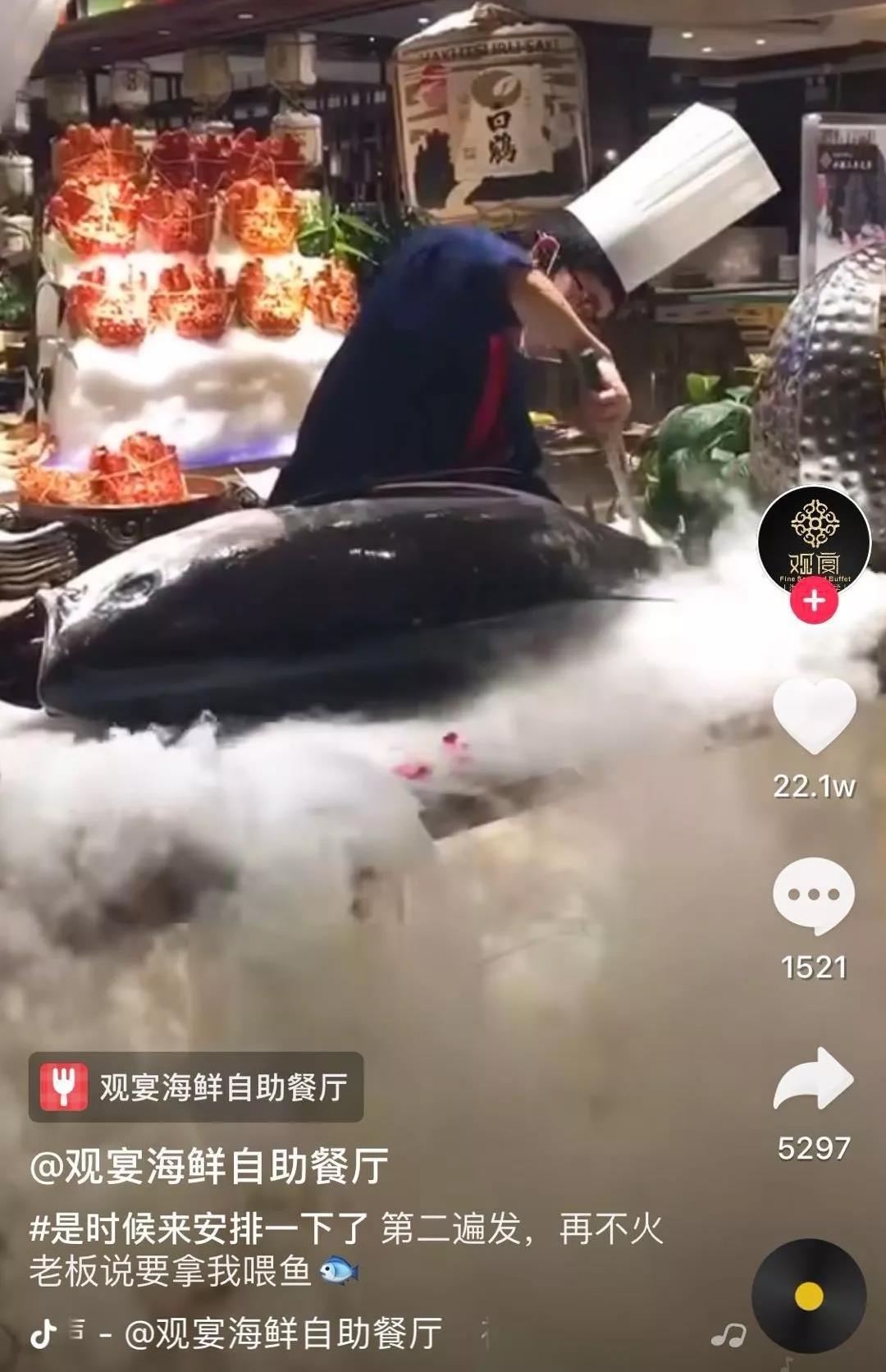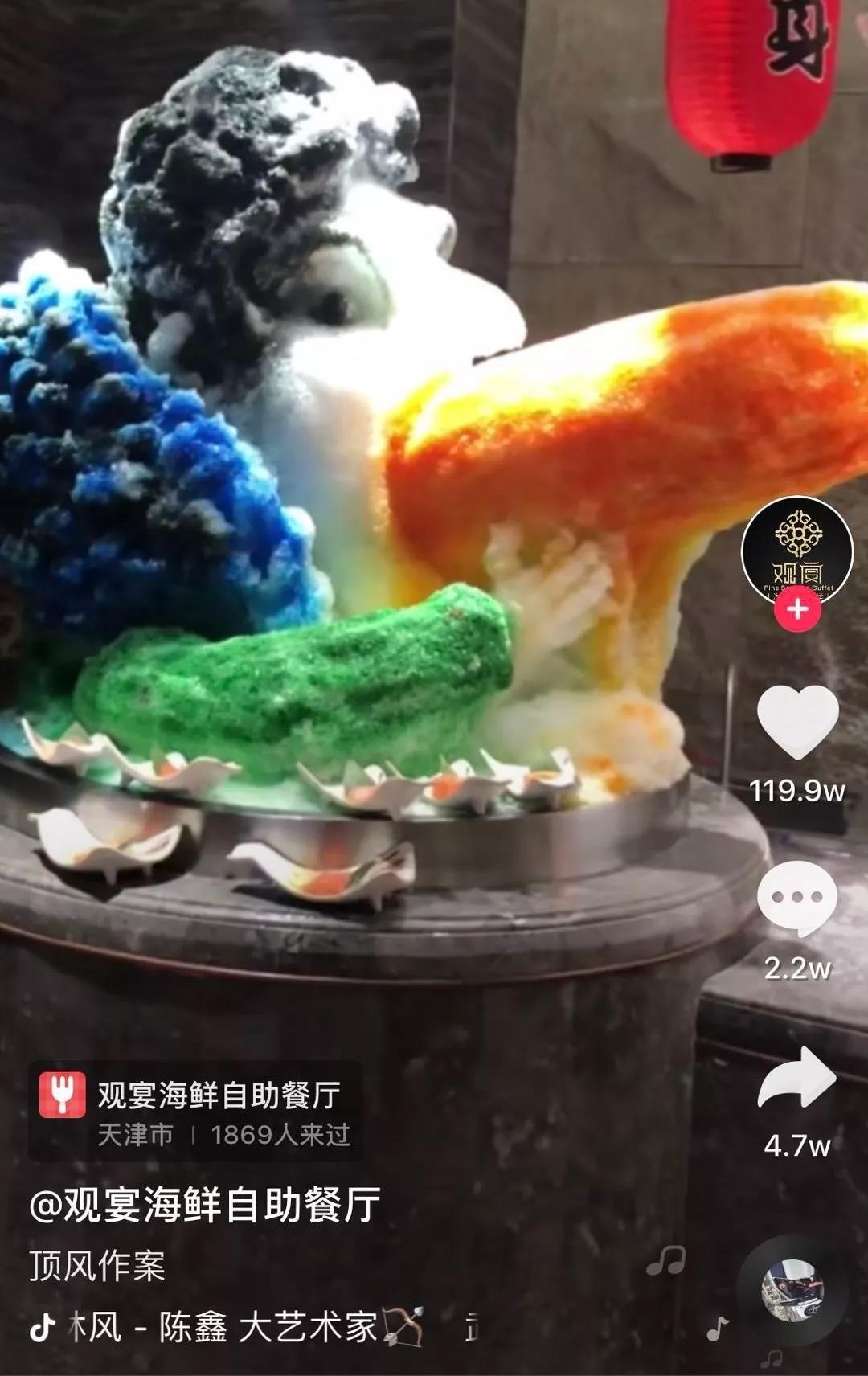 每过一段时间抖音就会流出一批“神曲”、流行场景的爆火视频,我们制定了蹭热点方案,用抖音上的热门音频、热门拍摄手法、近期热点进行拍摄,为“观宴”策划用冰雕制作热点形象的视频。